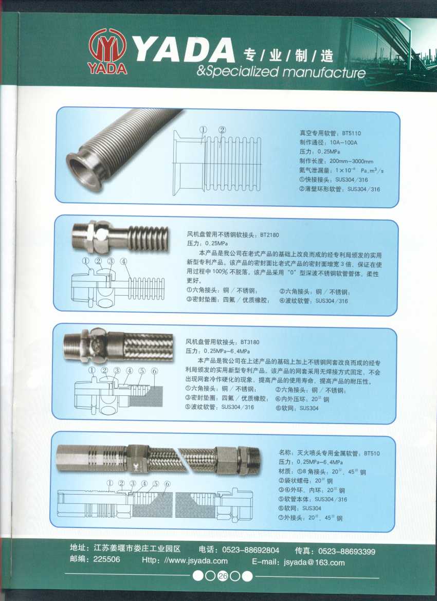 秉天時 籍地利 仰人和 虔誠一個永恒的理念,創(chuàng)新永續(xù).百諾不如一信,亞達人堅持以信為本,視客戶如同上帝,把對信譽的追求,體現(xiàn)在嚴格的質量控制和完善的客戶服務上,讓客戶百分之百滿意是亞達人不變的信念。 本廠系ISO9001質量認證企業(yè)、計量合格企業(yè)。本廠專業(yè)致力于生產(chǎn)不銹鋼金屬波紋軟管、超高壓、高壓膠管、波紋管補償器(膨脹節(jié))、立式、臥式、冷卻器。本廠產(chǎn)品具有承受壓力高、彎曲半徑小、抗疲勞性能強、使用壽命長等特點。廣泛應用于電力、石化、冶金、水泥建材、工程機械、礦山及液壓系統(tǒng)。產(chǎn)品暢銷全國各地。 今日亞達之成功源自諸多客戶的厚愛,明天的輝煌更離不開您對我的支持與信賴。查看更多>>